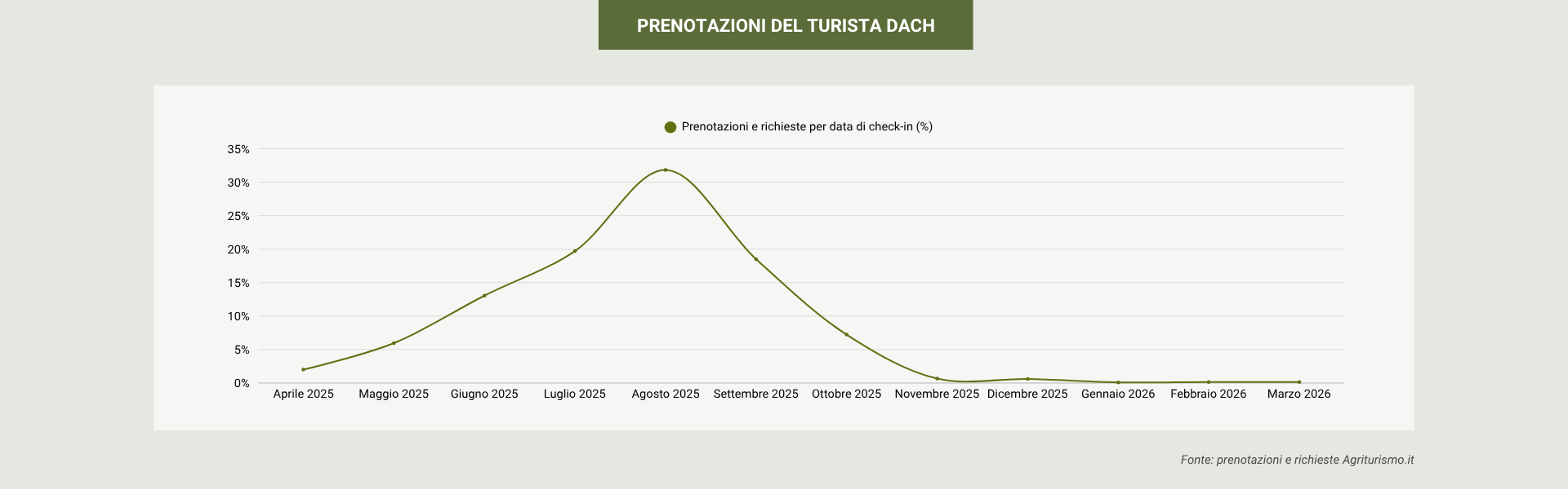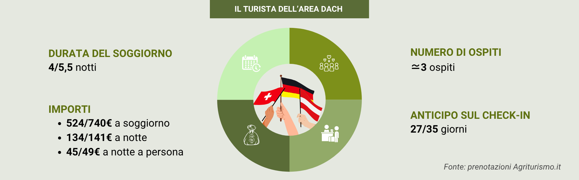 Il viaggiatore tedesco che sceglie l’agriturismo italiano è un ospite consapevole, curioso e attento. Una parte significativa di loro, tra il 20% e il 25% dei rispondenti a un nostro sondaggio di ottobre 2025, dichiara di essere disposta a spendere di più per strutture realmente sostenibili, dove la cura dell’ambiente si traduce in atti concreti: qui troviamo ad esempio l’uso responsabile dell’acqua, di materiali riciclabili, la riduzione della plastica e le esperienze a zero impatto ambientale. Quando decidono di viaggiare fuori l’alta stagione estiva, lo fanno soprattutto per ritrovare calma e autenticità, lontani dalle masse turistiche: un desiderio espresso dal 78% dei rispondenti.