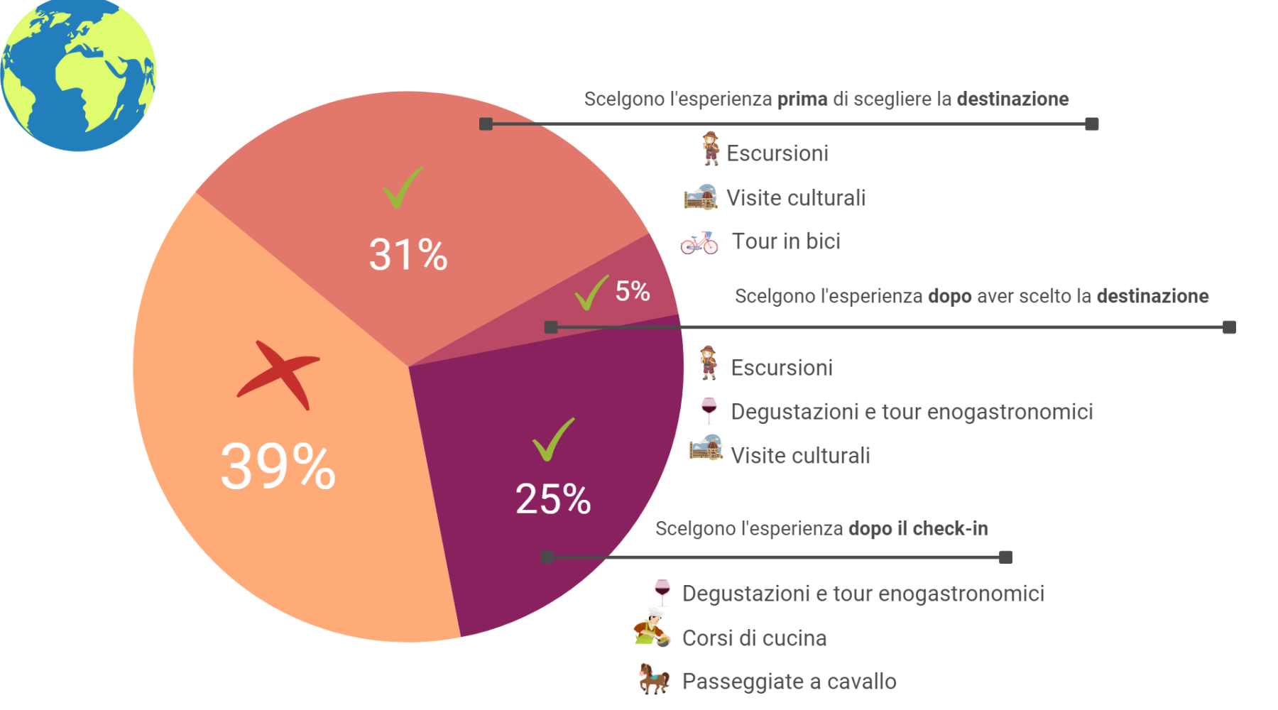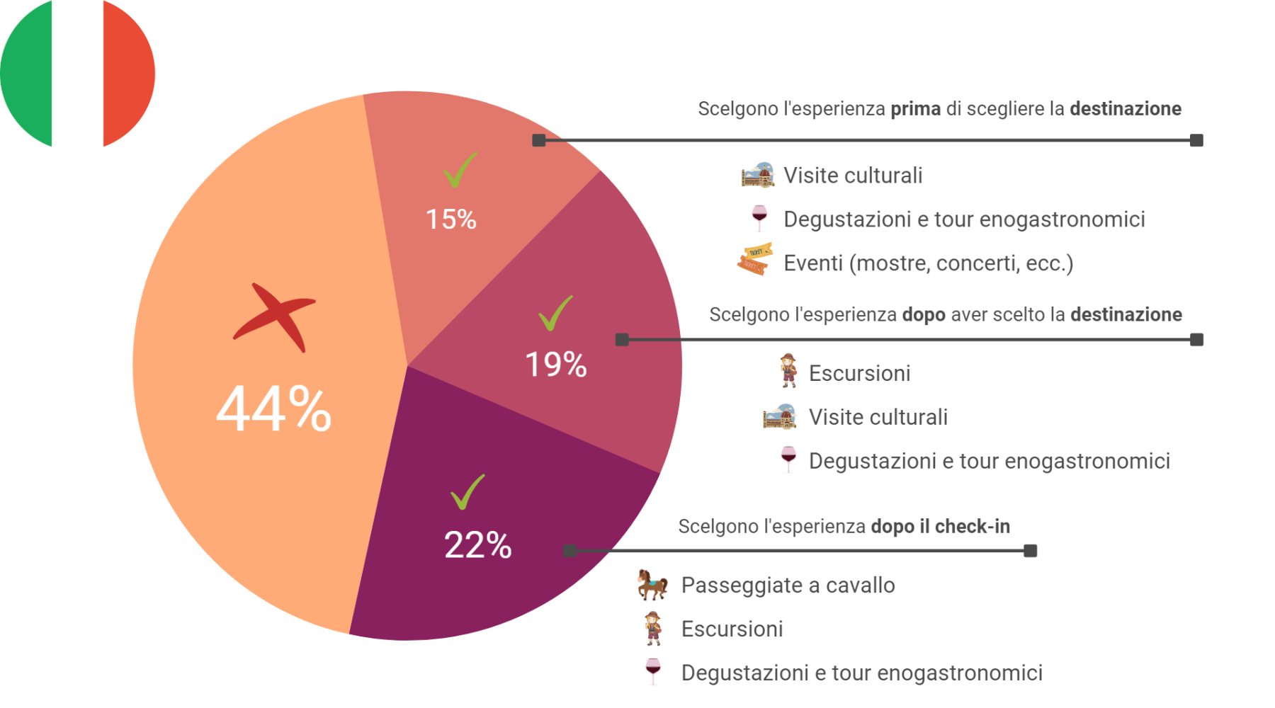 Scendendo più nel dettaglio, vediamo che una grossa differenza tra turisti italiani e stranieri riguarda le quote di chi ha ben chiaro l’esperienza che vuole fare in vacanza e la sceglie e prenota prima di prenotare il soggiorno: è probabile che la struttura dove soggiornare venga scelta principalmente in funzione delle attività ed esperienze che sono disponibili nella struttura stessa o nel territorio circostante.